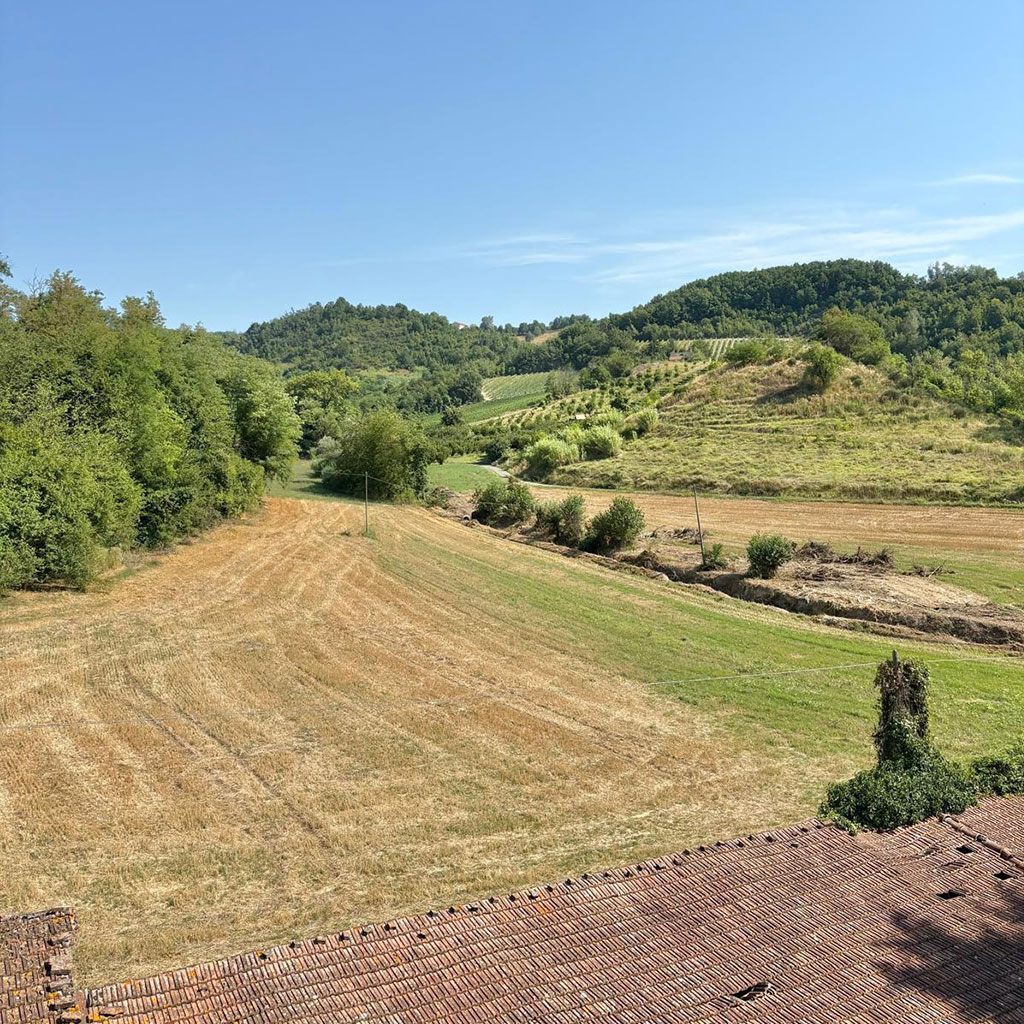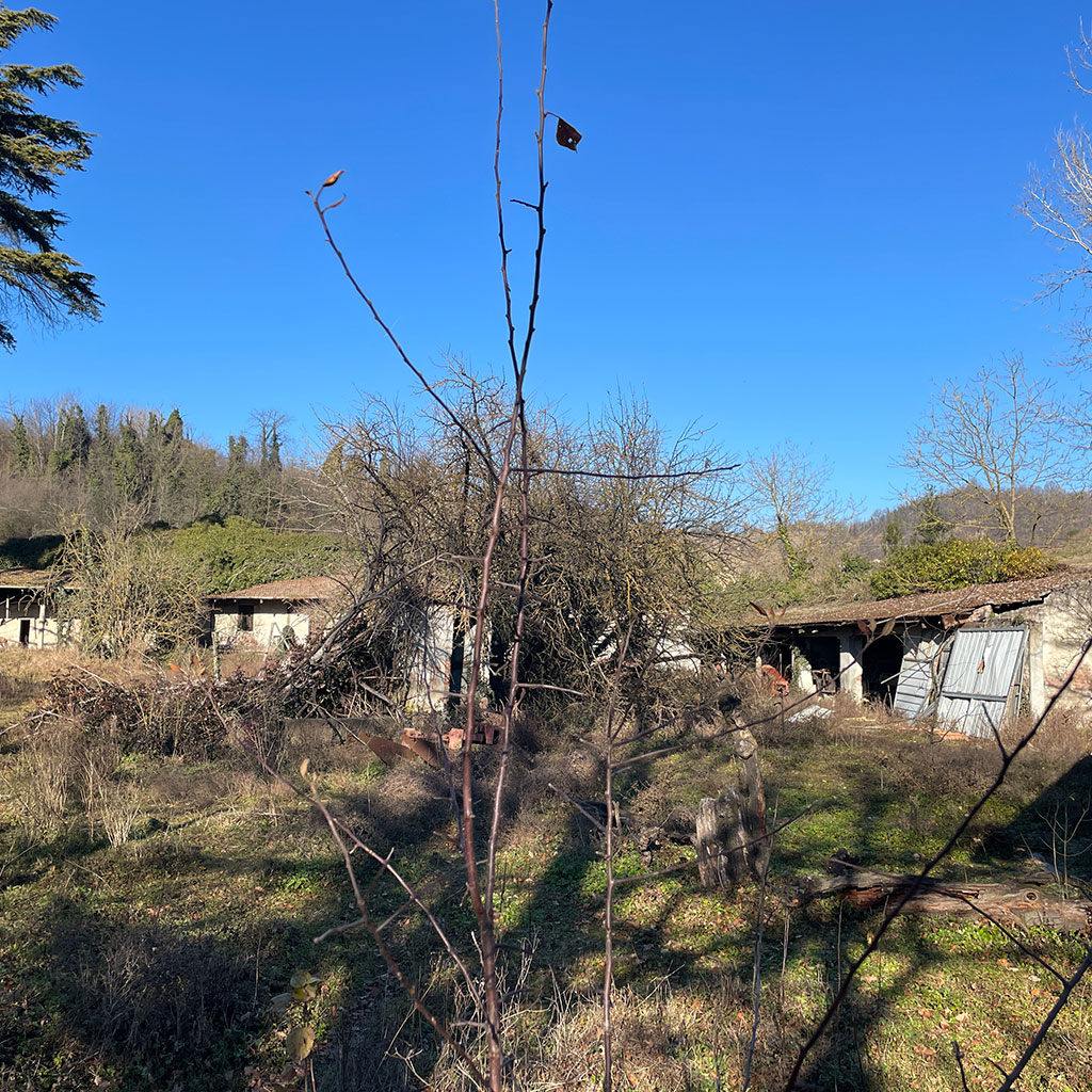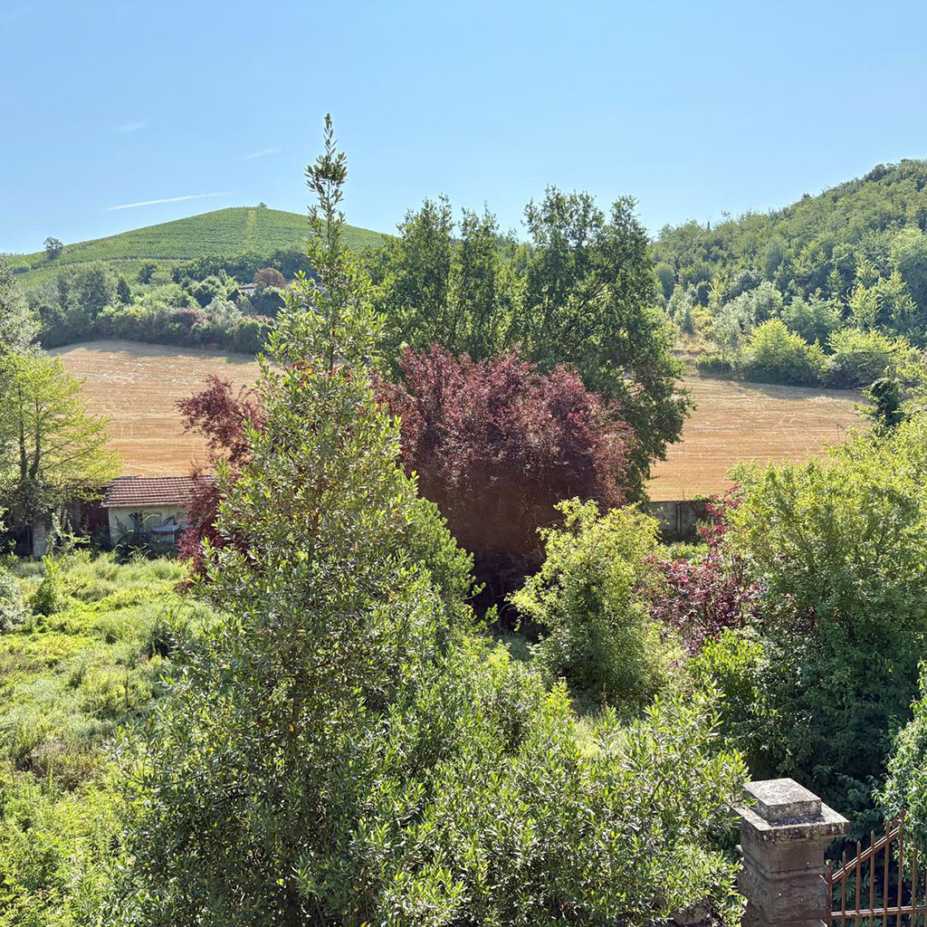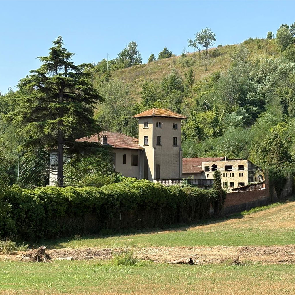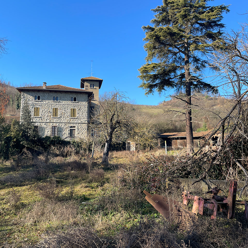 La tenuta copre 14 ettari in lieve pendenza. Il castello, costruito agli inizi del Novecento (circa 800 m²), sorge su un pianoro centrale. A nord-ovest si trovano le ex scuderie e il fienile (circa 600 m²) disposti intorno a un cortile; sul versante sud il complesso rurale principale (circa 700 m²) comprende l’antica cascina con cantine voltate. Più a valle, lungo il torrente, due case coloniche indipendenti aggiungono altri 400 m². Strade poderali e sentieri collegano i diversi corpi edilizi attraversando vigneti, prati e brevi tratti boschivi.