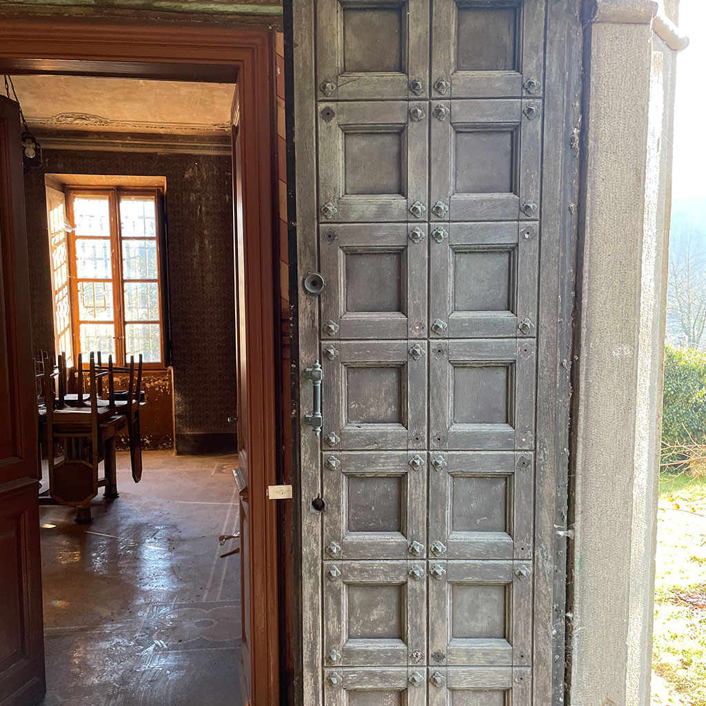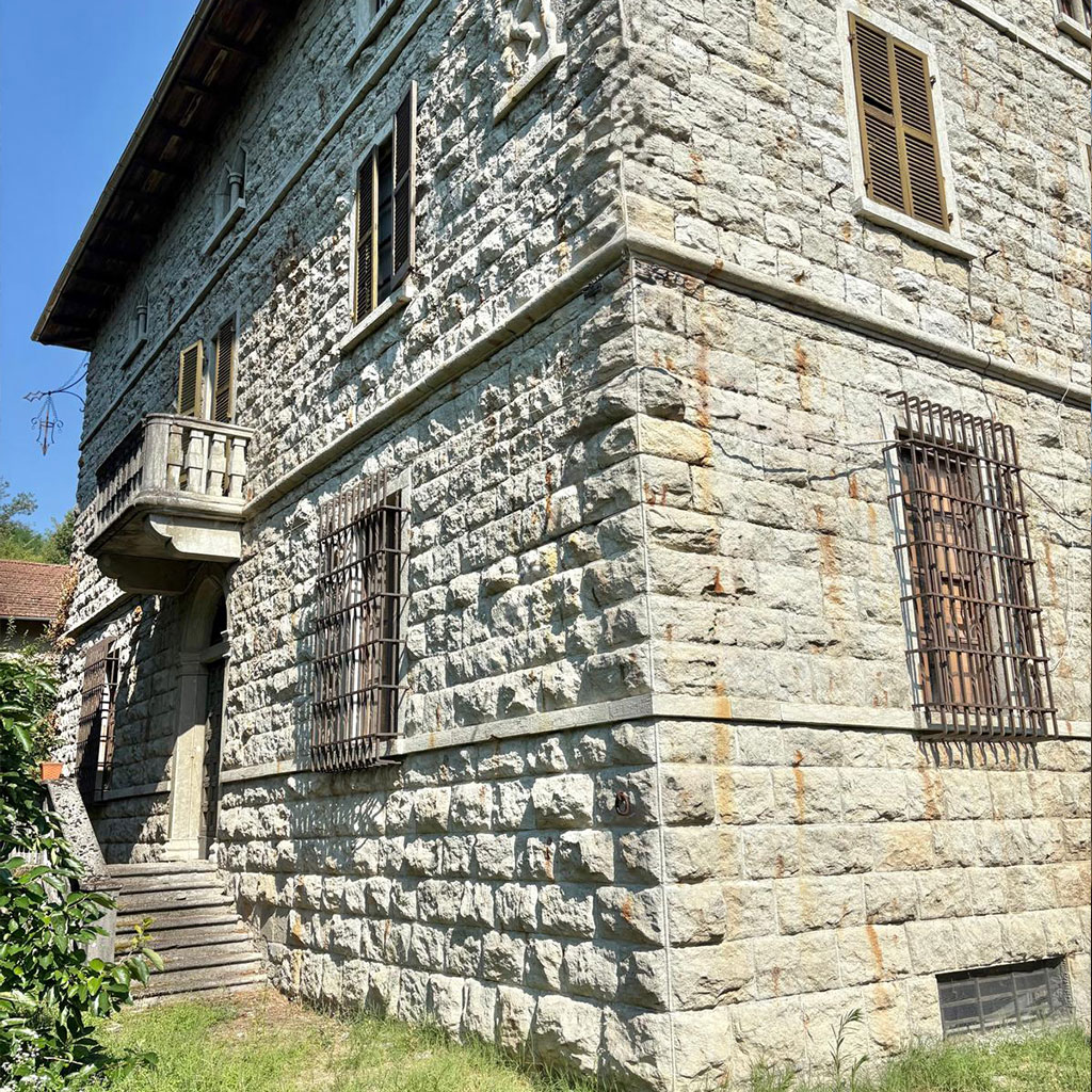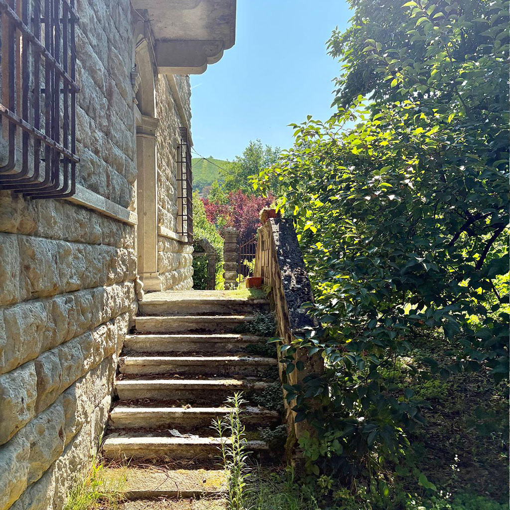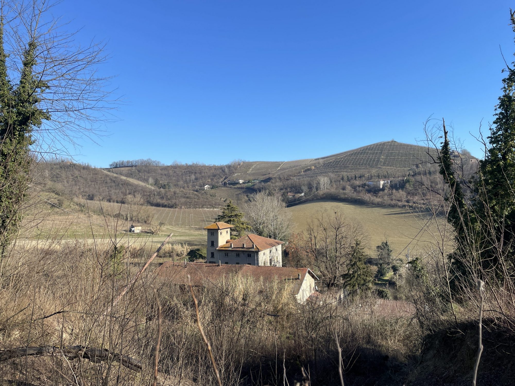 La tenuta copre 14 ettari in lieve pendenza. Il castello, costruito agli inizi del Novecento (circa 800 m²), sorge su un pianoro centrale. A nord-ovest si trovano le ex scuderie e il fienile (circa 600 m²) disposti intorno a un cortile; sul versante sud il complesso rurale principale (circa 700 m²) comprende l’antica cascina con cantine voltate. Più a valle, lungo il torrente, due case coloniche indipendenti aggiungono altri 400 m². Strade poderali e sentieri collegano i diversi corpi edilizi attraversando vigneti, prati e brevi tratti boschivi.